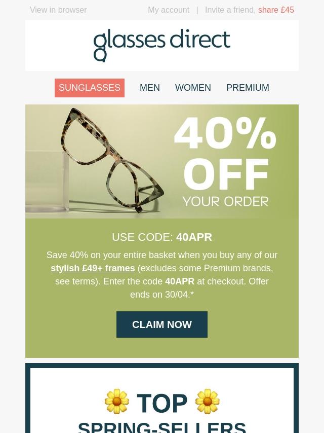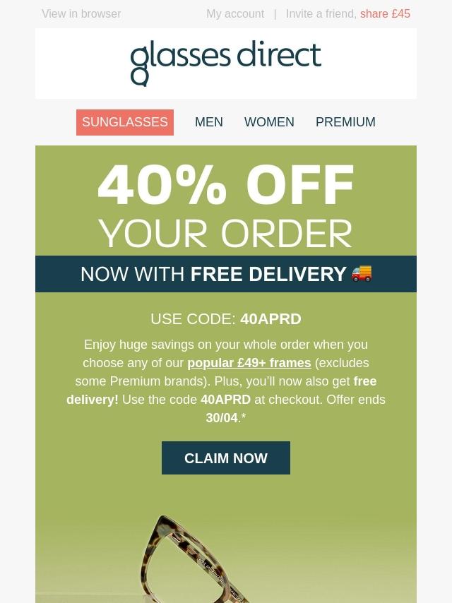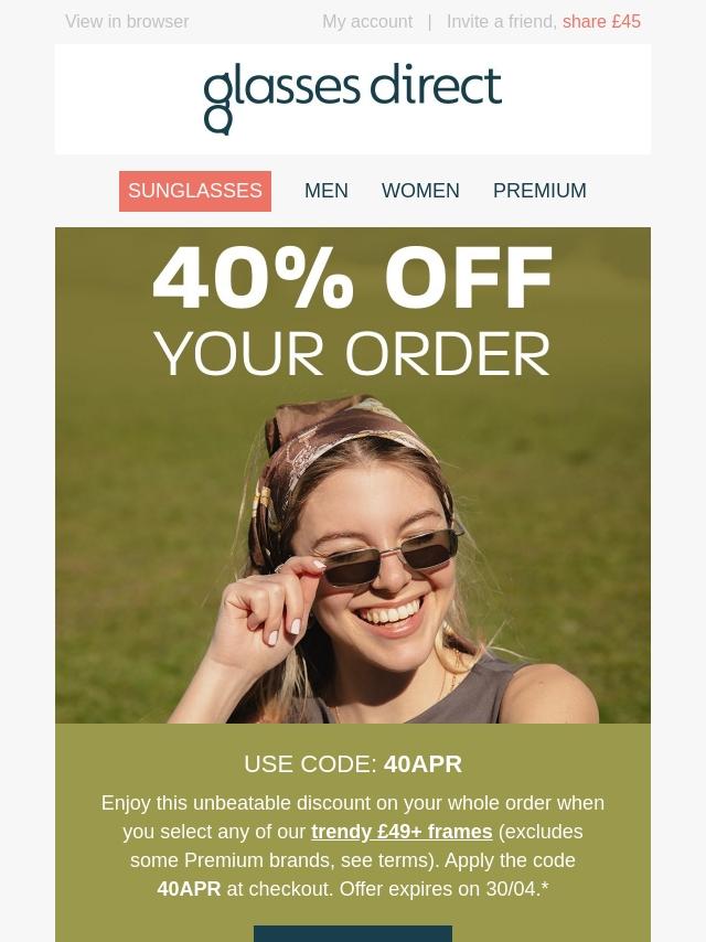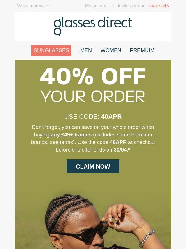 Get 40% off 2-for-1 Frames + 30% off Len...
