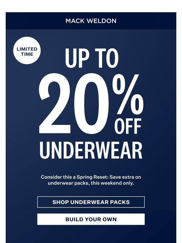 Going on now: Up to 20% off underwear.