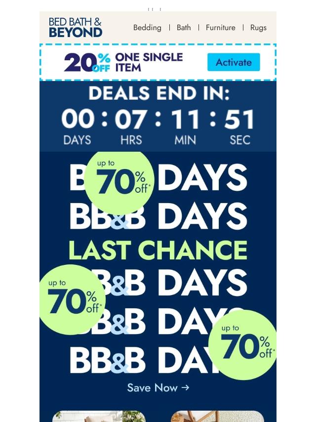 Hours left ⏰ BB&B Days up to 70% off
