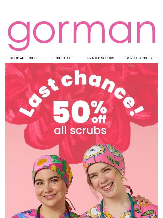 Last chance! Save 50% on scrubs, no code...