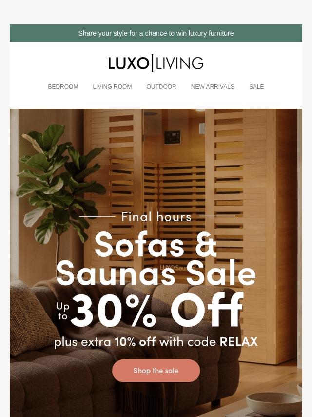 Up to 30% off sofas and saunas ends Tues...