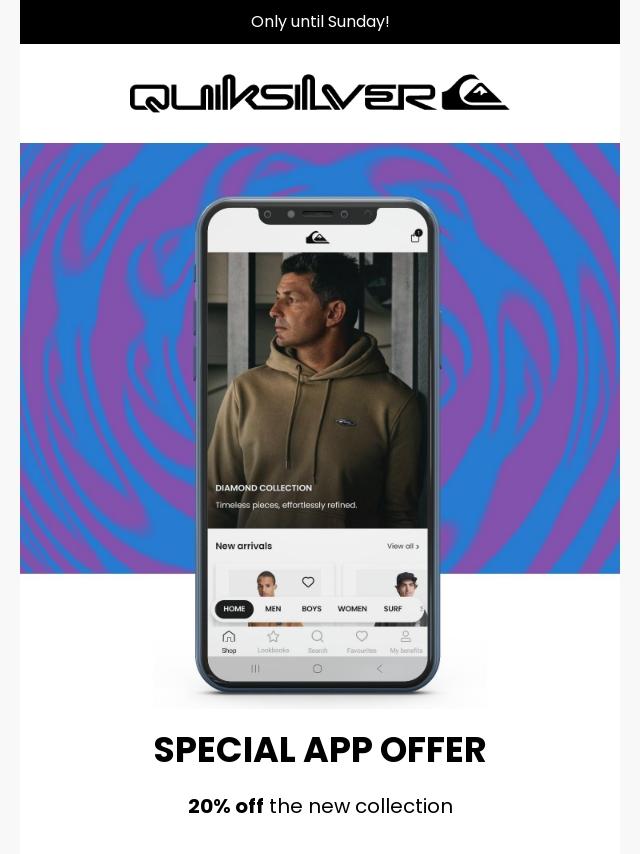 Enjoy 20% off on the Quiksilver app